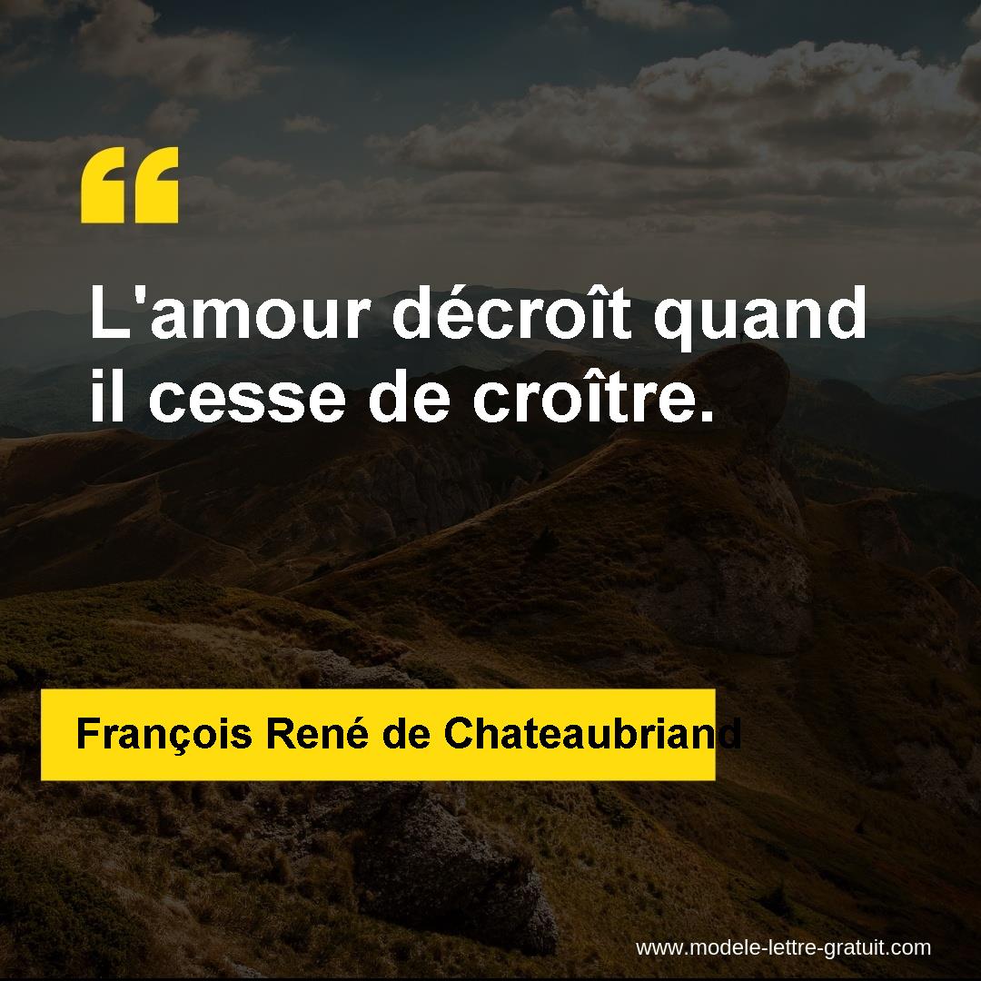 FrançoisRené de Chateaubriand ;. Des citations belles, profondes ou pleines d'humour sur le thème de l'amour Choisissez parmi nos citations sur le thème de l'amour et envoyez une jolie carte à votre amoureux ou amoureuse !. L'amour décroît quand il cesse de croître Une citation de Chateaubriand.