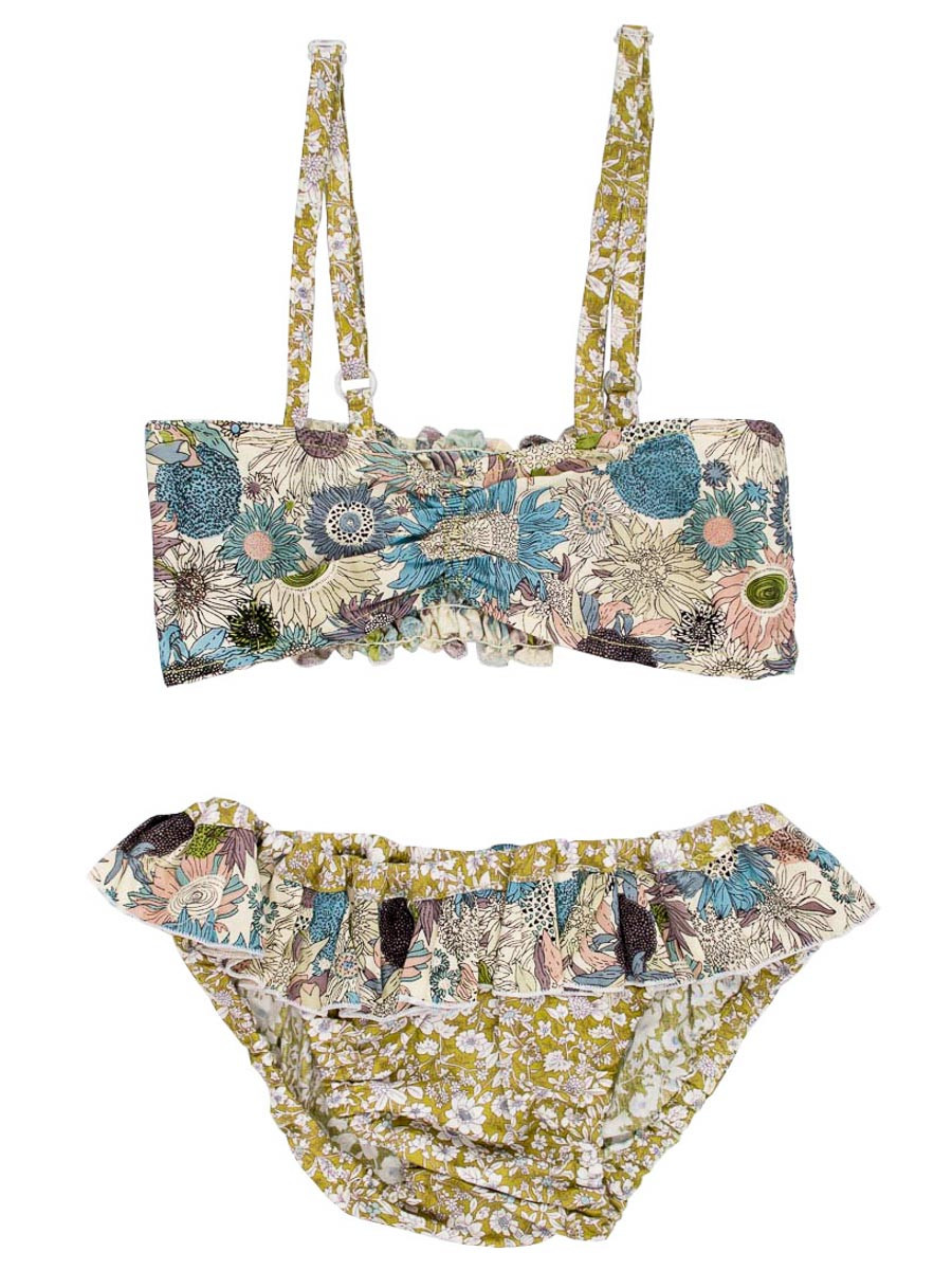 Bikini Maillot De Bain Coton Fille 4 10 Ans Vert Olive Et Fleurs Bleues