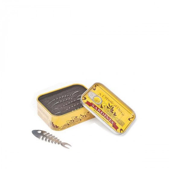 Tartinade de sardines Papilles à l'affut Un petit apéritif ?. Ces fausses boites à sardines sont parfaites pour surprendre vos invités La boîte est fabriquée en aluminium garanti contact alimentaire et est recyclable Nous vous conseillons un lavage à la main Le traitement des surfaces intérieurs rend ces boites de conserves compatibles avec les aliments acides et le vinaigre. Le monde de la conserve de poisson ressemble aux mains rugueuses d’António José do Carmo Cet homme de 97 ans a les yeux qui brillent quand il regarde la table de travail où, autrefois, les femmes en sabots et tablier blanc étêtaient la sardine avec maestria.