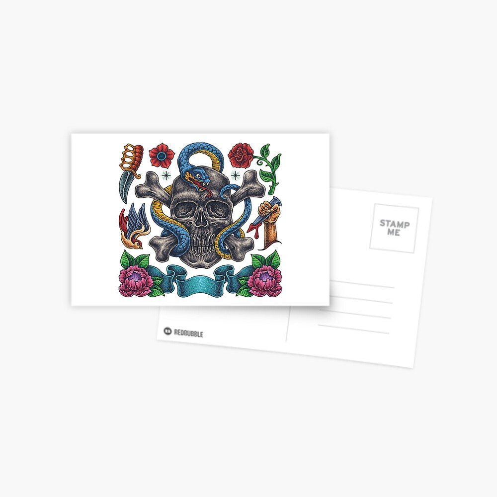 Skull With Snake Tattoos Of Old School Classic Style Tattoos Postcard By Maxexp Redbubble