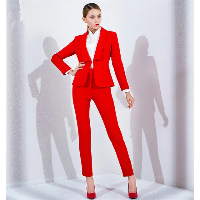 Rouge Femmes D Affaires Travail Costumes Femme Bureau Uniforme Un Bouton Soiree Diner Dames Formel Pantalon Costumes 2 Piece Blazer Aliexpress