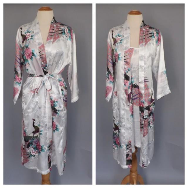 Vintage 1980s 1990s Peignoir Set White Peacock Print Robe And Nightgown Asian Kimono Robe Pin Up Girl Oriental Bridal Lingerie Sexy Teddy Weddbook