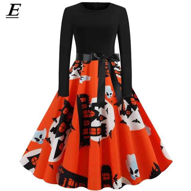 Robe Pin Up Vintage Dress Winter Skull Print Halloween Dress Women Long Sleeve 50s 60s Rockabilly Party Dresses Big Swing Shinth