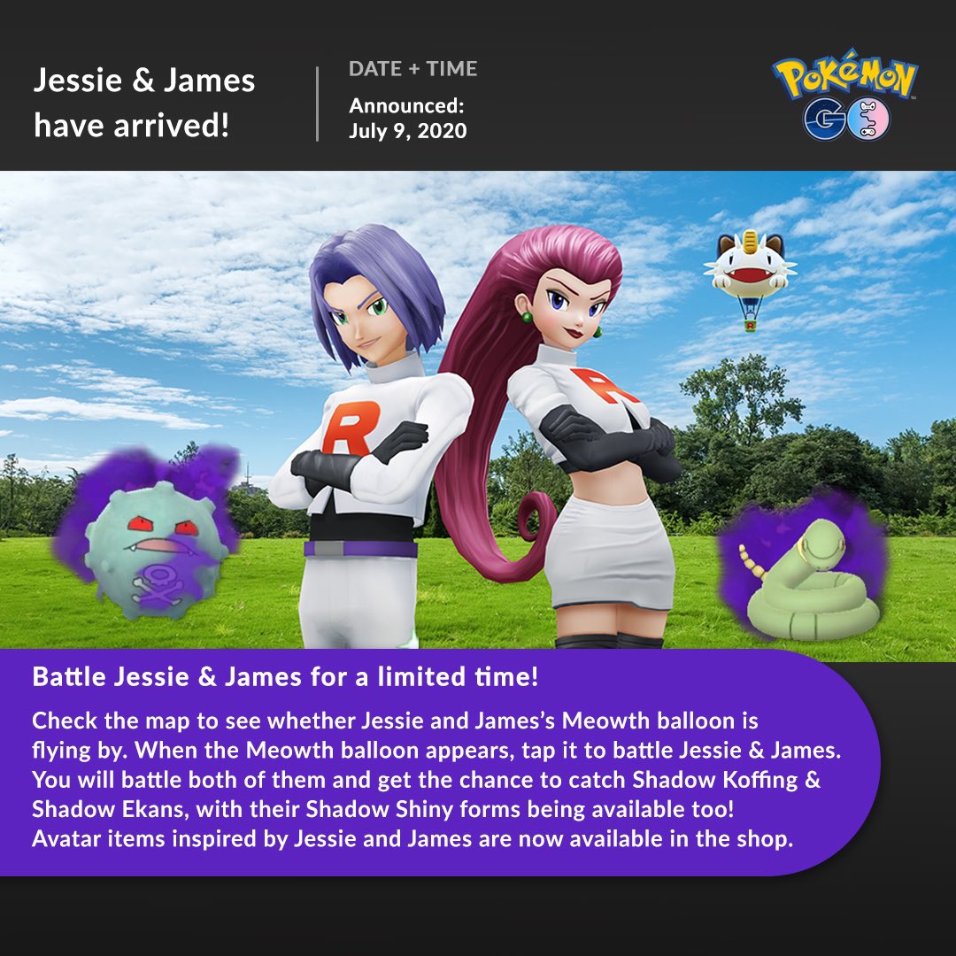 Jessie and James will be returning in their Meowth balloon with different Shadow Pokemon to battle Jessie And James Event Times And Spawn Rates The event starts on December 14th at 8 AM local time, but Jessie and James’s Meowth balloon will be appearing more frequently on Friday, December 25, , from 800 am to 1000 pm local time.