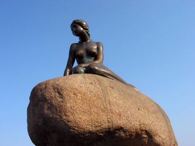 La Petite Sirène (en danois den lille havfrue) est une statue en bronze sur un rocher dans le port de Copenhague, dans le parc Churchill Il s'agit d'une représentation du personnage du conte éponyme de Hans Christian Andersen. La ville de Copenhague est située sur la côte orientale de l'île de Seeland, mais aussi sur l'île plus petite d'Amager, laquelle se trouve face au détroit d'Øresund, qui relie la mer du Nord à la mer Baltique et sépare le Danemark de la Suède La partie ouest de Copenhague est relativement plate, mais on trouve un terrain plus accidenté au nord et au sud de la ville. La Petite Sirène de Copenhague, le monument le plus célèbre du Danemark, a été « vandalisée » ce matin une main inconnue a inscrit les mots « Racist Fish » (« Poisson raciste ») en.