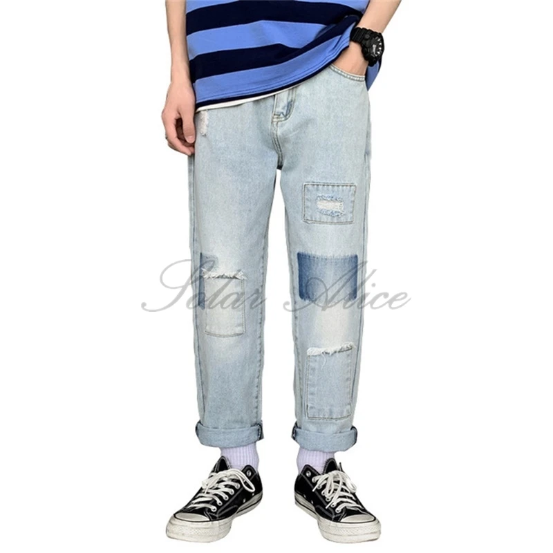 Livraison Gratuite Hommes Printemps Ete Nouveau Taille Moyenne Droite Cheville Longueur Jean Ample Adolescent Patch Dechire Pantalons Decontractes Aliexpress