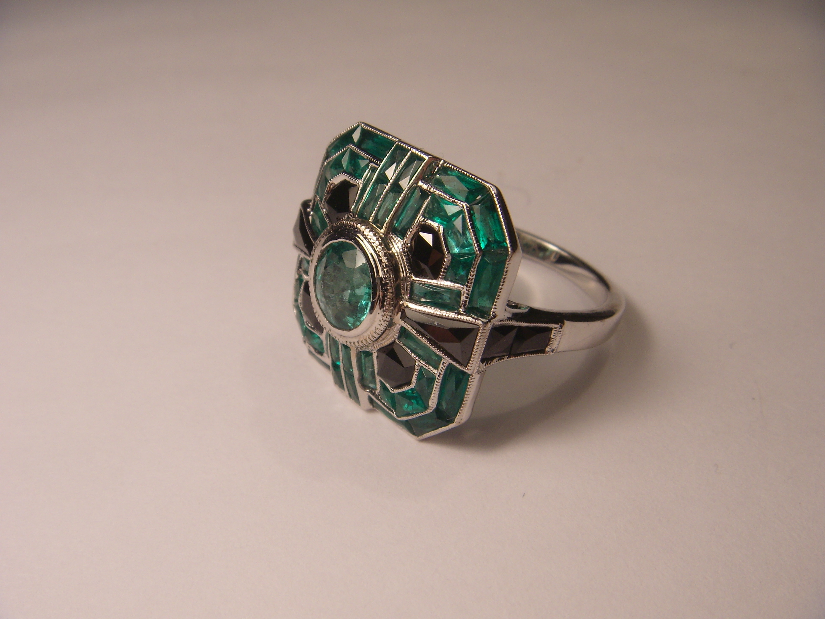Magnificent Art Deco 18k Or Blanc Main Coupe Emeraude Onyx Mosaique Bague Anneau Ebay