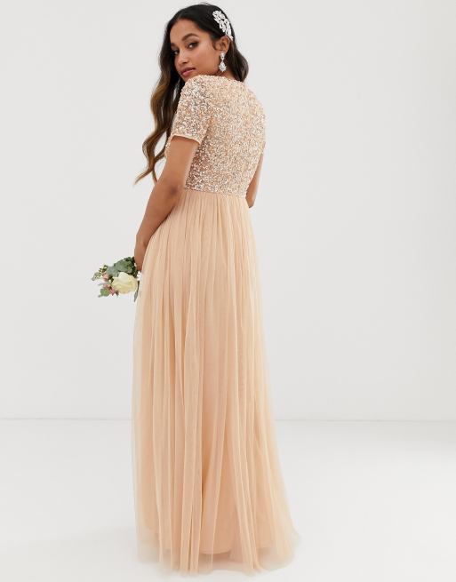 Maya Petite Robe Longue Col V De Demoiselle D Honneur Avec Sequins Delicats Peche Doux Asos