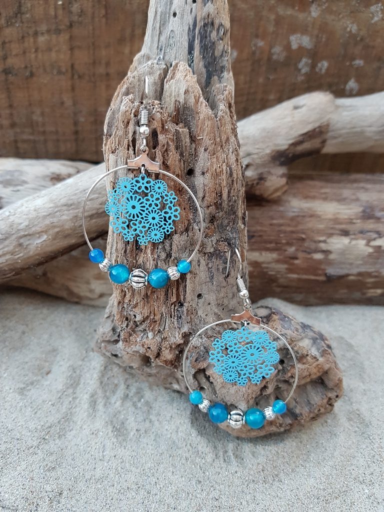 Boucles Oreilles Rondes Perles En Agate Bleu Estampe Fleurs Bleu L Atelier De Zaboo