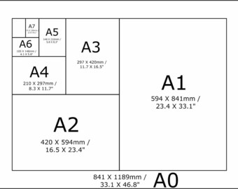 A0 841 × 11 mm A1 594 × 841 mm 4 × 594 mm A3 297 × 4 mm 210 × 297 mm A5 148 × 210 mm A6 105 × 148 mm 74 × 105 mm A8 52 × 74 mm 37 × 52 mm A10 26 × 37 mm A11 18 × 26 mm A12 13 × 18 mm A13 9 × 13 mm 2A0 11 × 16 mm 4A0 16 × 2378 mm A0 914 × 1292 mm A1 609 × 914 mm A3 329 × 4 mm ©. Format Width x height inches Width x height mm A1 331 x 234 inches 841 x 594 mm 234 x 165 inches 594 x 4 mm A3 165 x 117 inches 4 x 297 mm. ISO 216 is an international standard for paper sizes, used across the world except in North America and parts of Latin AmericaThe standard defines the "A", "B" and "C" series of paper sizes, including , the most commonly available paper size worldwideTwo supplementary standards, ISO 217 and ISO 269, define related paper sizes;.