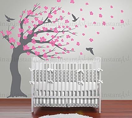 Happygoluck1y Fleurs Rose Sticker Mural Motif Arbre Avec Oiseaux Pour Enfant Ado Filles Chambre De Bebe Decoration Murale Amazon Fr Cuisine Maison