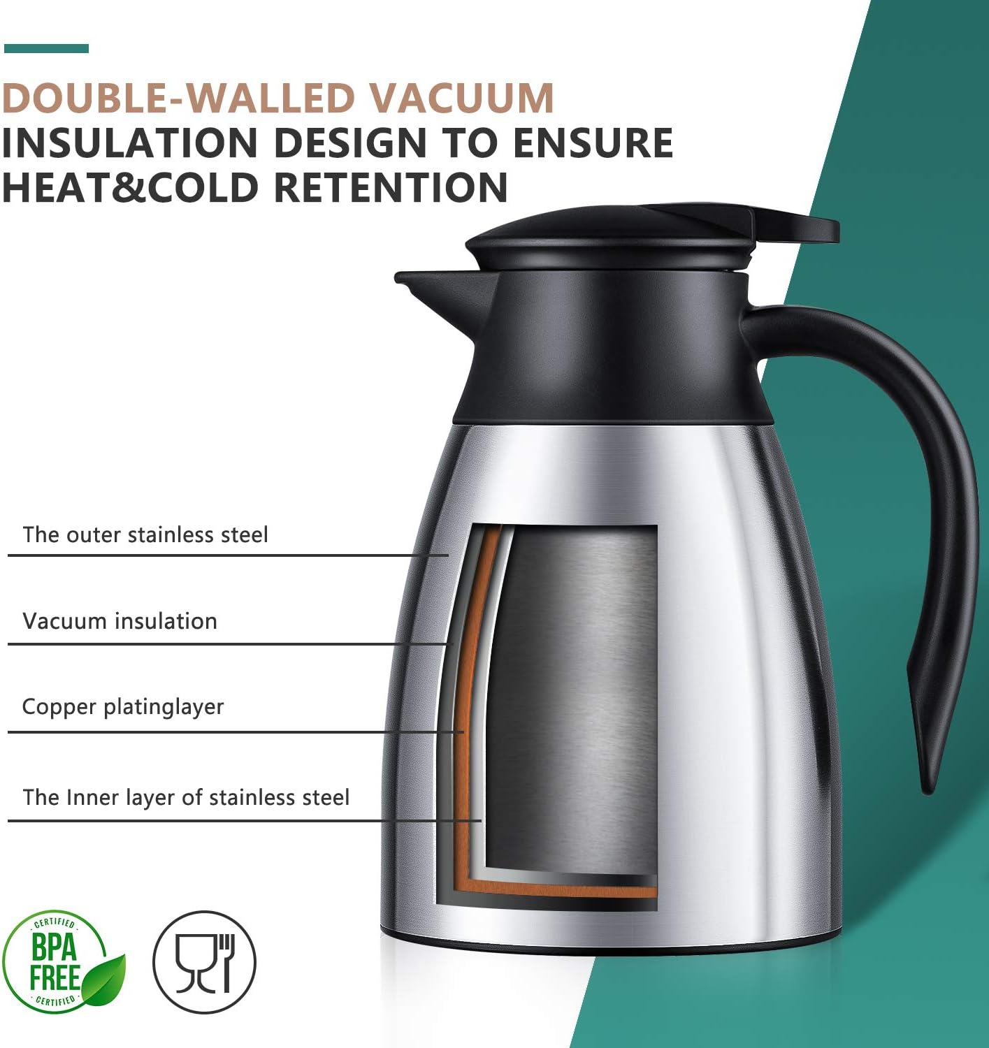 Argent 2l Pichet Isotherme Thermos Sous Vide Isole Acier Inoxydable Carafe A Cafe En Papier Thermique Bouteille Disolation Scelle Etanche Avec Simple Bouton De Securite The Chaud Et Froid Cuisine Maison Cafe
