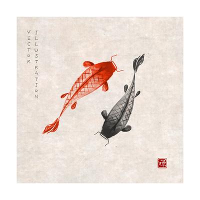 Red And Black Koi Carps Hand Drawn With Ink In Traditional Japanese Painting Style Sumi E On Vintag Art Print Elina Li Art Com