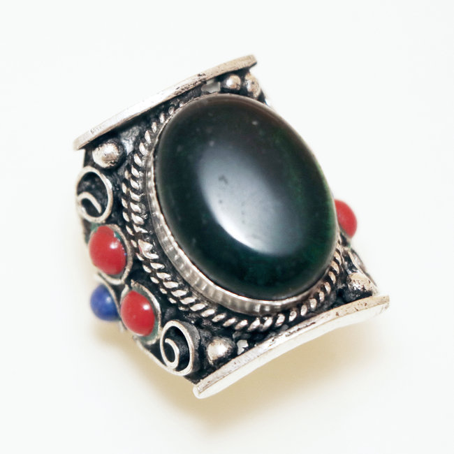 Bijoux Ethniques Inde Bague Laiton Plaque Argent Et Pierre Fine Ovale Grave 006 Verre Artisanal Vert