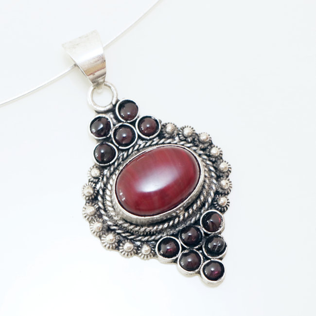 Bijoux Indiens Ethniques Grand Pendentif Filigrane Laiton Plaque Argent 925 Et Verre Artisanal De Boheme Ovale