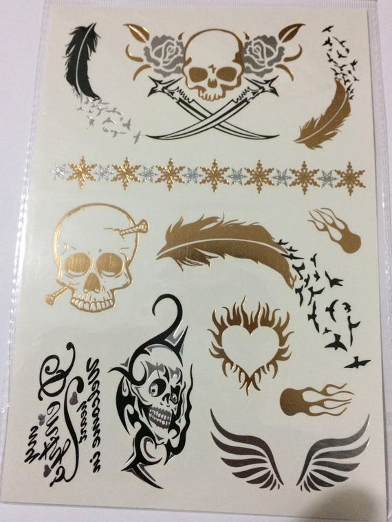 Plume En Or Argent Tete De Mort Feu Coeur Epee Grunge Tattoo Etsy