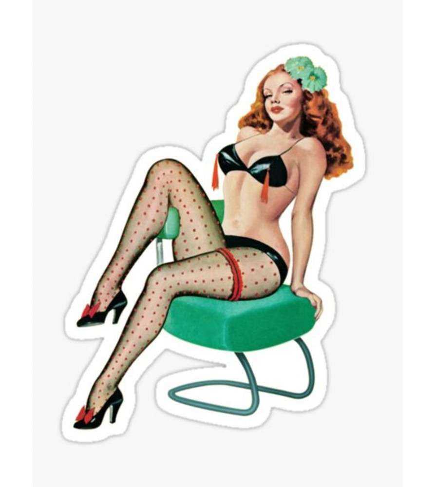 Mini Sticker Pin Up Rousse Sous Vetement Noir Sur Chaise Verte Style Annee 50 Retro