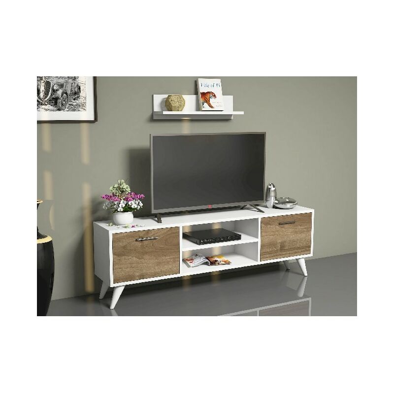 Homemania Sedef Meuble Tv Moderne Avec Portes Etageres Par Salotto Blanc Chene En Bois 160 X 30 X 45 Cm Rakuten