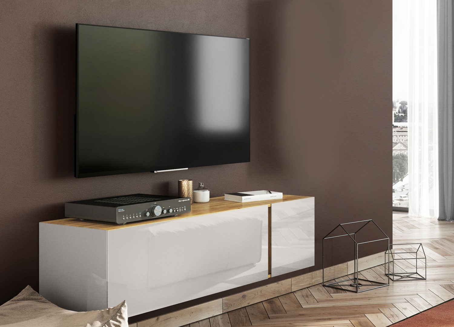 Meuble Tv Moderne Mural Blanc Et Bois Harry 1140