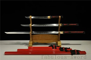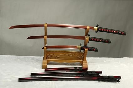 Amazon Com 1095 Carbon Steel Red Blade Forged Japanese Samurai Swords Set Full Tang Katana Wakizashi Tanto Free Send Black Stand Sports Outdoors