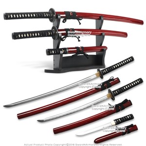 Set Of 3 Burgundy Japanese Style Samurai Sword Set Katana Wakizashi Tanto Stand