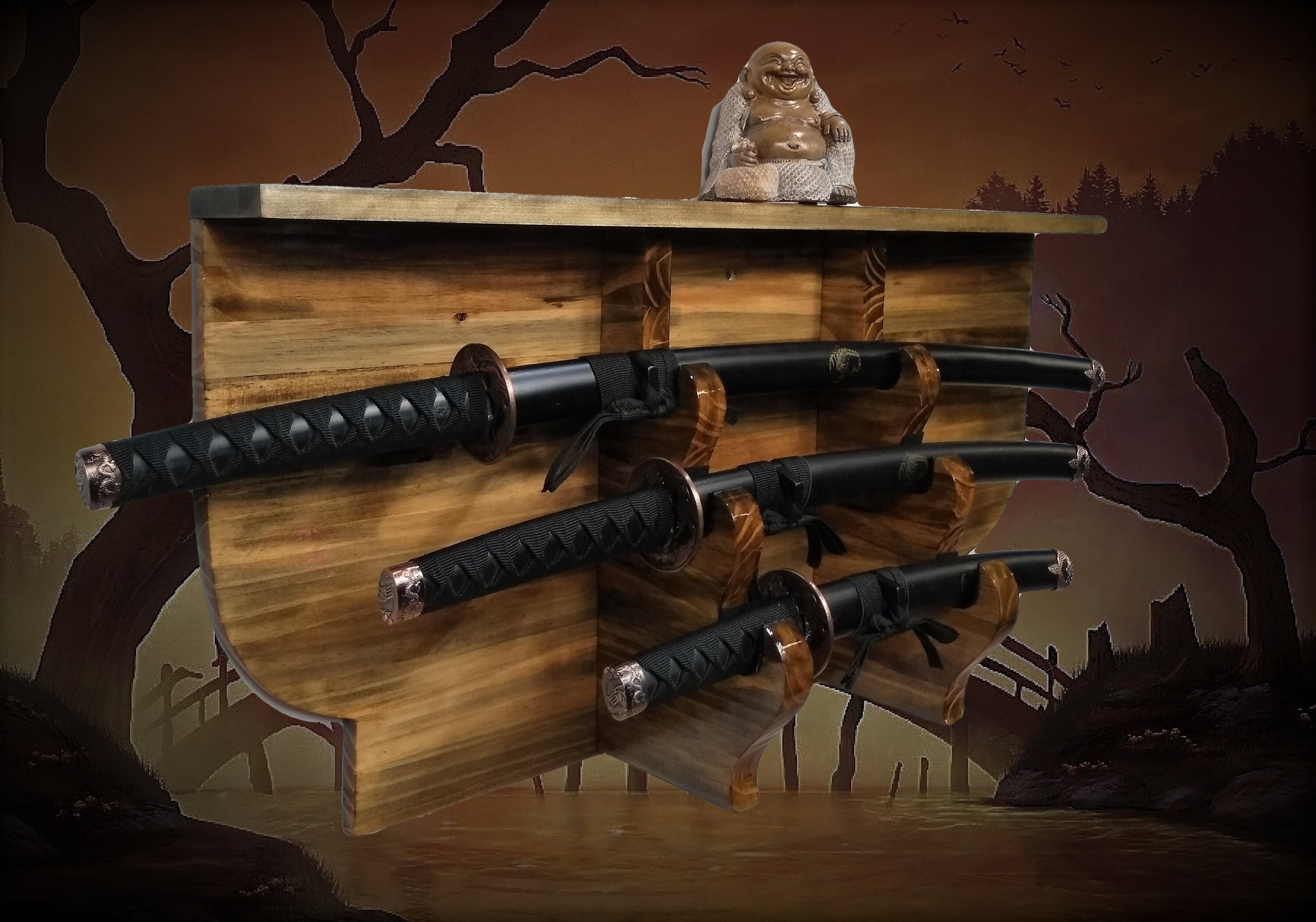 Rustic 3 Tier Sword Display Rack And Shelf Katana Wakizashi Tanto Samurai Vintage Bushido Decor Free Shipping