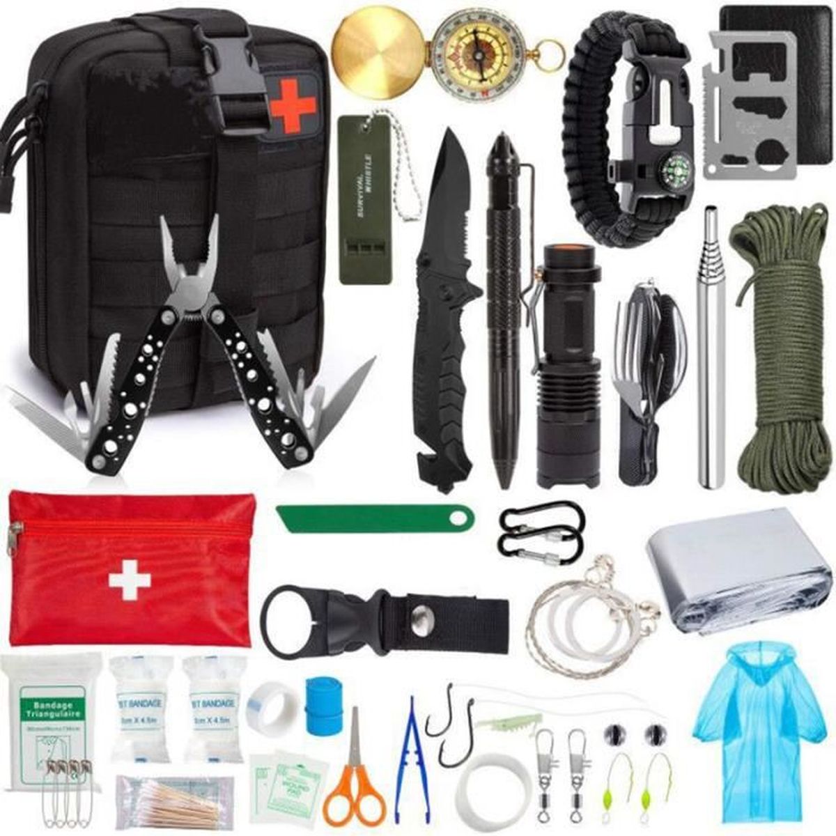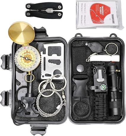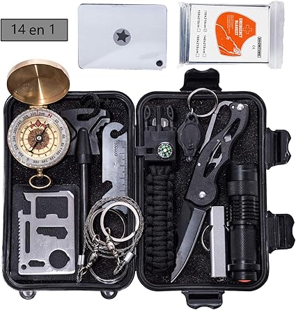 Kit De Survie D Urgence En 1 Nouveau Model Avec Trousse De Premiers Secours Couteau De Survie Lampe De Poche Allume Feu Boussole Camping Paracorde Pour Randonnee Etc Normes Ce Fda Bsci Amazon Fr Sports