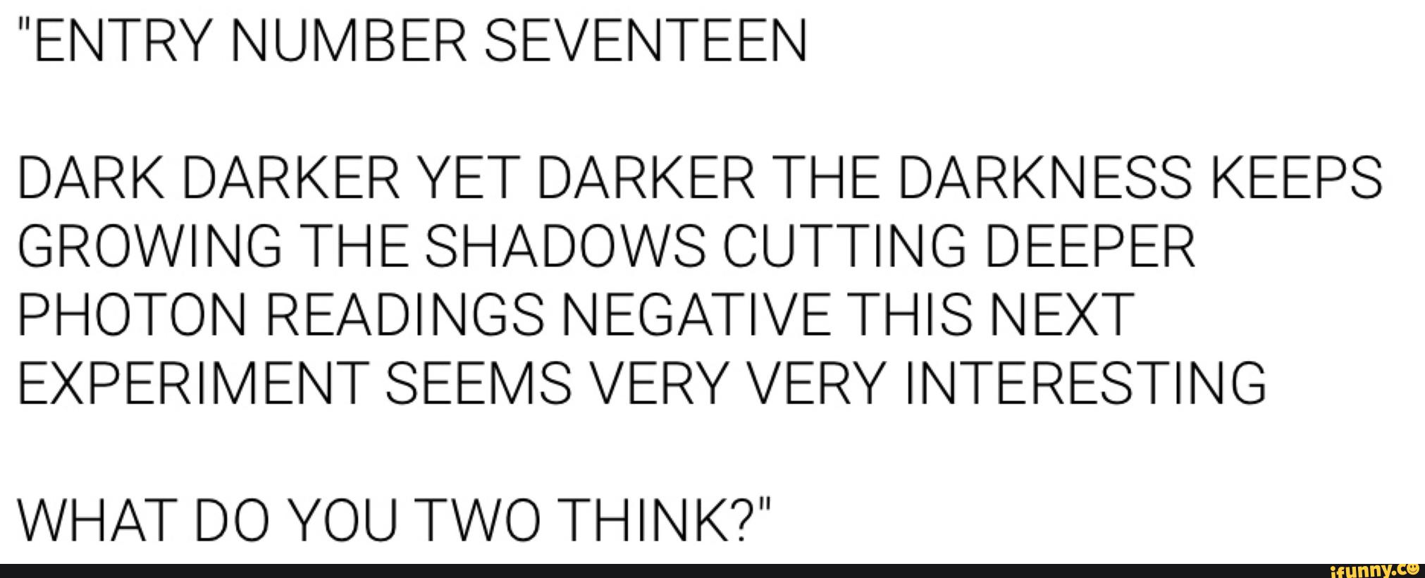 Entry Number Seventeen Dark Darker Yet Darker The Darkness Keeps Growing The Shadows Cutting Deeper Photon Readings Negative This Next Experiment Seems Very Very Interesting What Do You Two Think Ifunny