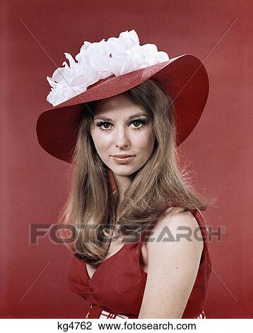 1960s Brunette Portrait Femme Porter A Grand Chapeau Rouge Banque D Image Kg4762 Fotosearch