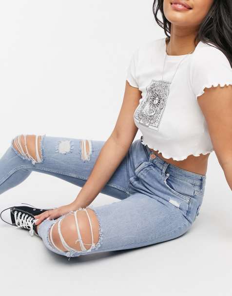 Jean Bleu Taille Haute Details Dechires Petite Missguided