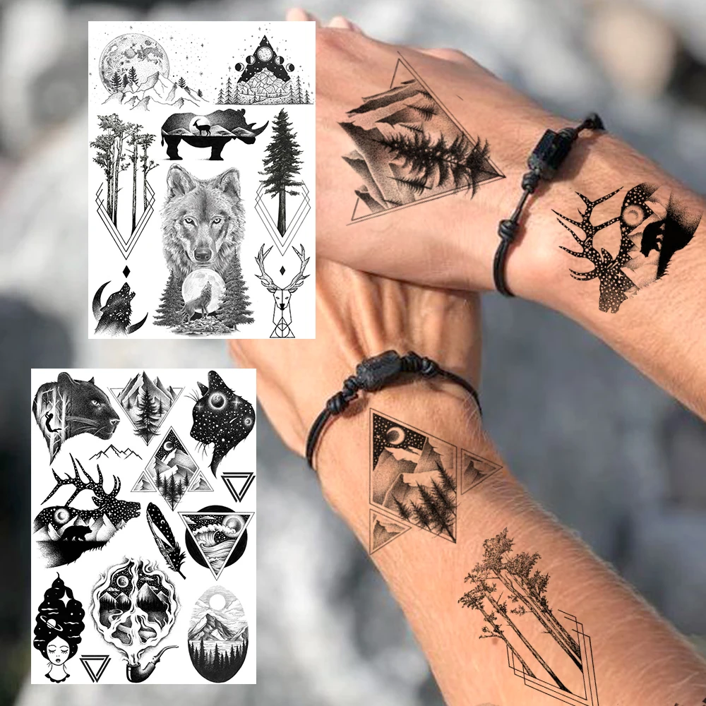 Univers Noir Impermeable Tatouages Temporaires Pour Garcons Hommes Loup Triangle Faux Tatouage Arbre De Montagne Corps Mains Wapiti Feuilles Realistes Aliexpress