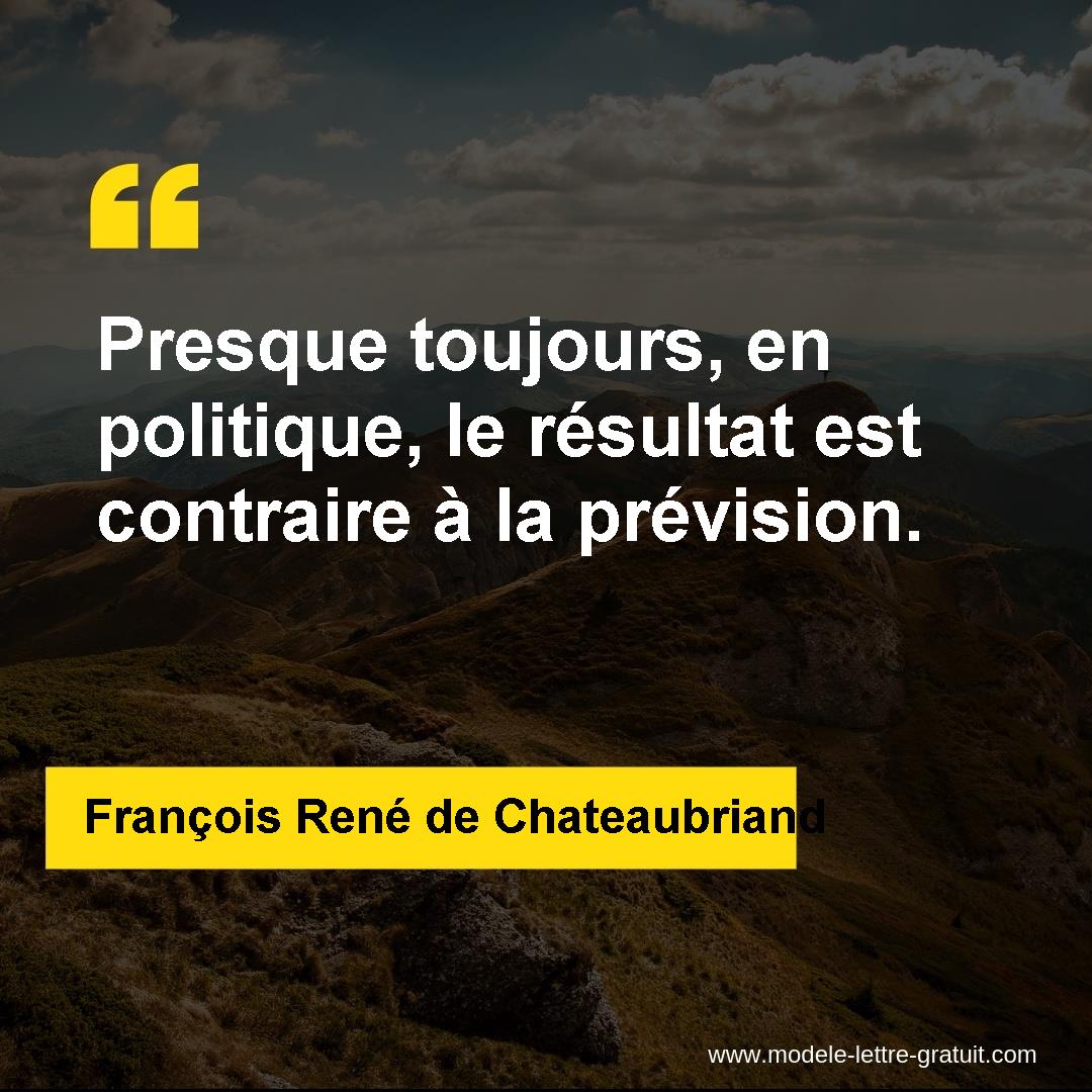 Dans les citations cidessous vous trouverez des citations similaires à la citation de François René de Chateaubriand (Presque toujours, en politique, le résultat est contraire à la prévision), contenant les termes Presque, toujours et politique. 5 Citations d’Emmanuel Macron pour mieux le comprendre;. Politique de confidentialité CitationsChateaubriand Posted on 16 septembre 18 Last updated on 8 juin 19 Categorized in Citations Written by admin « Il y a de la douceur à pleurer sur des maux qui n’ont été pleurés de personne.