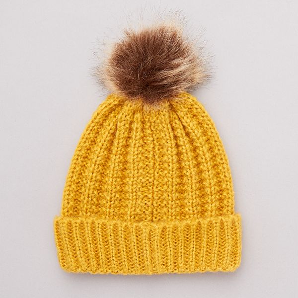 Bonnet Moutarde Ocre A Pompon Fourrure Taille Enfant Ou Adulte