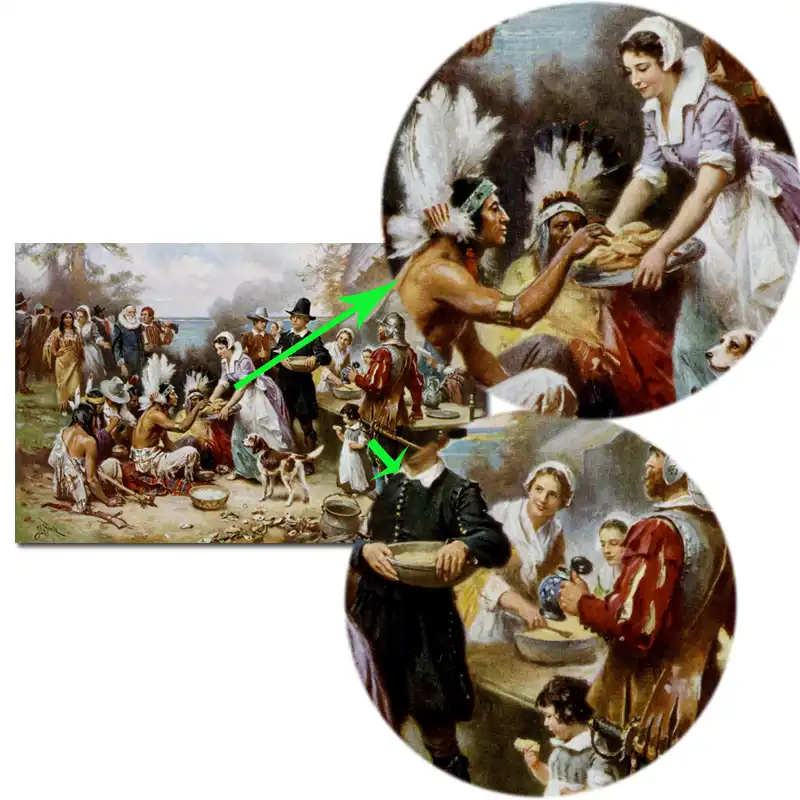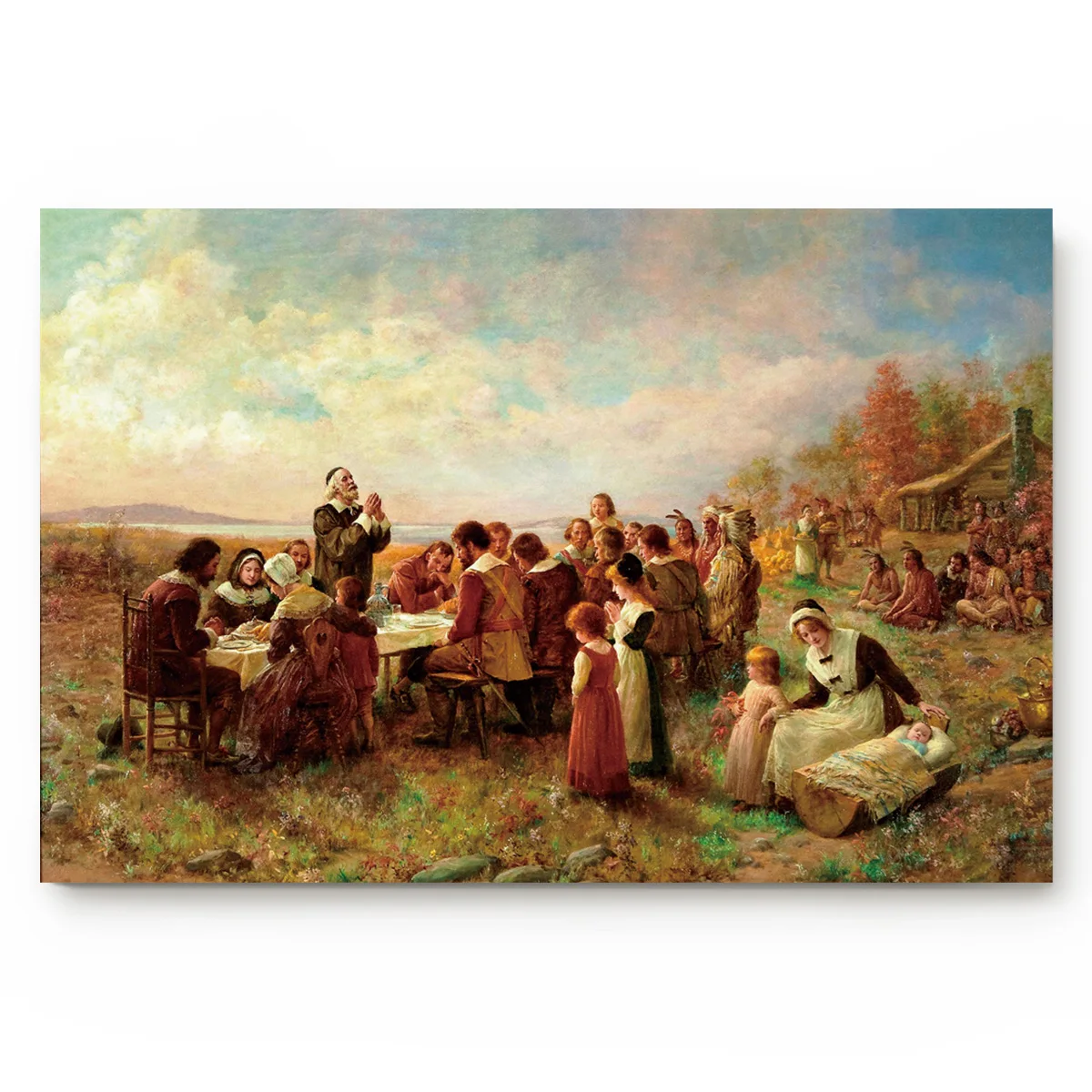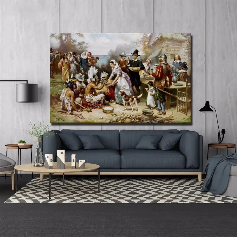 The first Thanksgiving, c1930 by Jean Leon Gerome Ferris canvas art print arrives ready to hang, with hanging accessories included and no additional framing required Every canvas print is handcrafted in the USA, made ondemand at iCanvas and expertly stretched around 100% North American Pine wood stretcher bars. Painting by Jean Leon Gerome Ferris Notice how the Wampanoag aren't sitting at the table We all know the story of Thanksgiving in the fall of 1621, the Pilgrims and the Native Americans put aside their differences to come together for a meal that was to give thanks for the plentiful fall harvest. More than any other image of Thanksgiving, Jean Leon Gerome Ferris’s 1912 illustration, The First Thanksgiving, 1621, captures the modern, idealised view of English colonists and Native Americans celebrating a harvest feast in friendshipCompleted as part of series, Pageant of a Nation, depicting key moments in US history, few would now be surprised to discover that the work carries an.