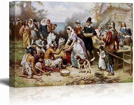 Wall26 The First Thanksgiving by Jean Leon Gerome Ferris Canvas Print Wall Art Famous Painting Reproduction 16" x 24" by wall26 48 out of 5 stars 59 ratings. Apr 17, 12 Pilgrims and Native Americans celebrate the first Thanksgiving in 1621 This is a reproduction of an oil painting from the series 'The Pageant of a Nation' The painting is by artist Jean Leon Gerome Ferris and was published by The Foundation Press, Inc of Cleveland, Ohio, c 1932. "The First Thanksgiving 1621", oil on canvas by Jean Leon Gerome Ferris (19) The painting in itself shows various misconceptions, including the historicity of the Pilgrim clothes and the attires of the Wampanoag.
