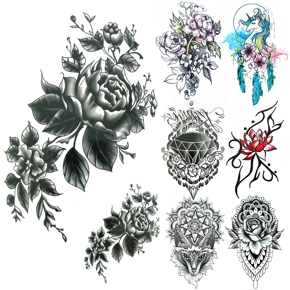 Black Jasmine Fake Temporary Tattoos For Women Mandala Henna Lily Flower Tattoo Geometric Lion Diamond Unicorn Lotus Tatoo Chest Temporary Tattoos Aliexpress