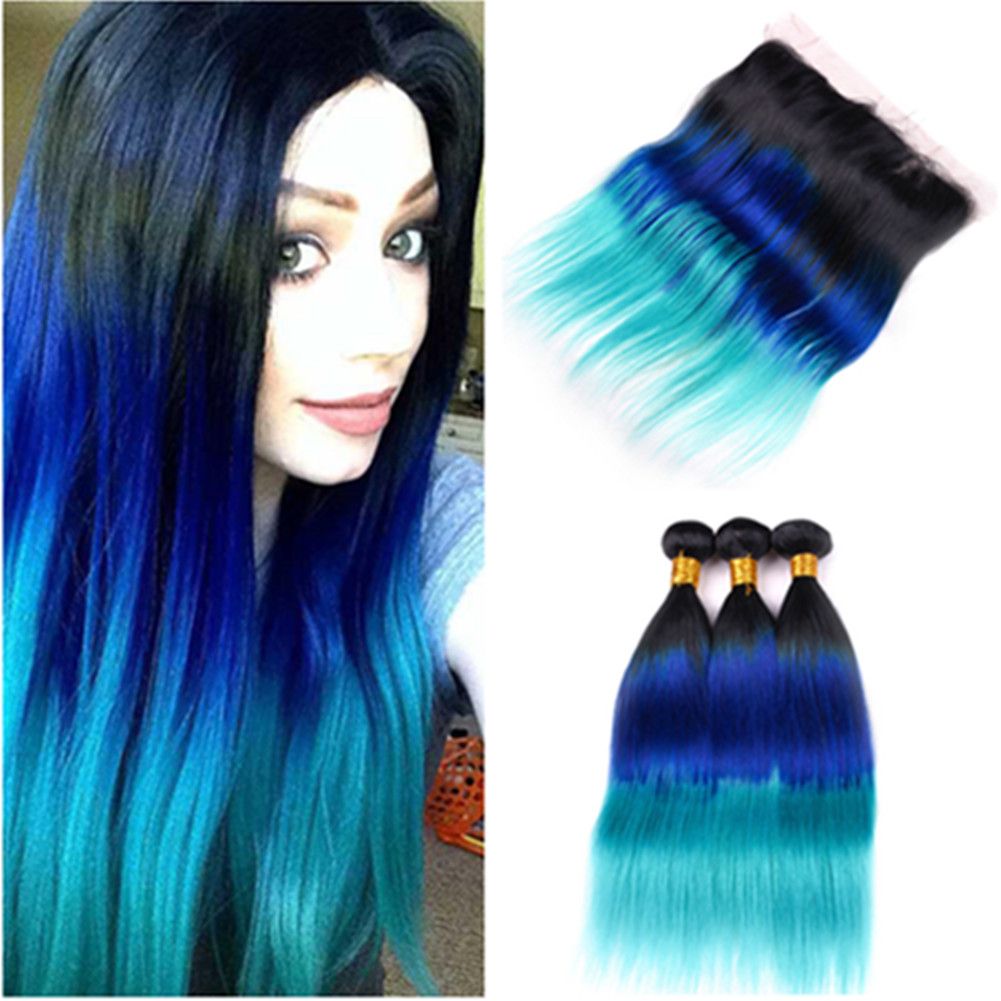 21 1b Blue Teal Ombre Straight Bundles And Frontal Black Roots Blue Teal 3tone Ombre Brazilian Hair Lace Frontal Closure 13x4 With Weaves From China Hair01 184 53 Dhgate Com