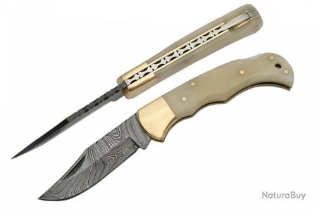 Couteau De Poche Baroudeur Laguiole Lame Damas Manche Corne Claire