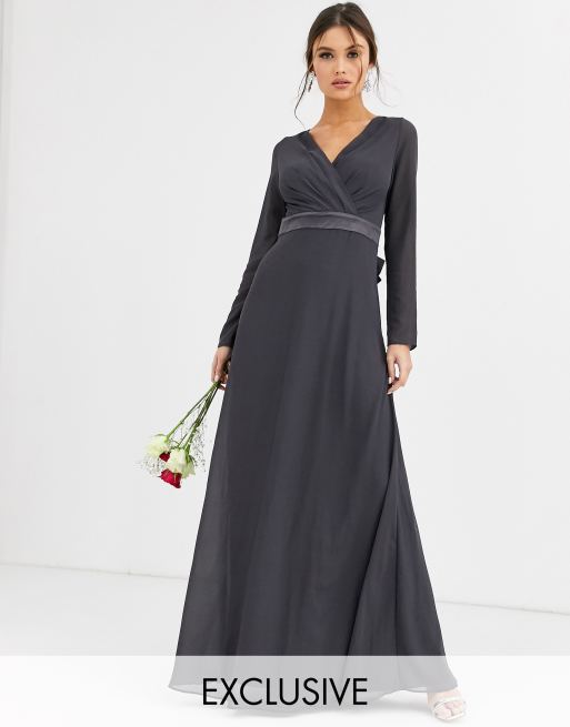 Tfnc Robe Longue A Manches Longues De Demoiselle D Honneur Avec Nœud En Satin Dans Le Dos Gris Asos