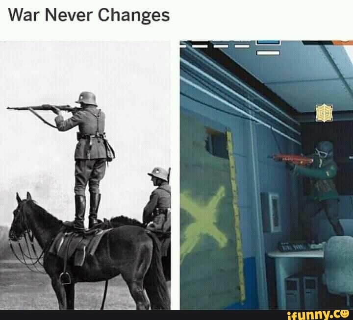 War never changes meme. At least the "CARES Act" also does no such thing as "criminalising memesharing", as far as I can tell It is a civil law establishing a small claims courts pathway for copyright infringement Both sides need to optin to this process If one side doesn't, exactly nothing changes. Nothing, the thinking went, was worth another Somme But of course the world—including the British—did go to war again For all the slaughter, Haig’s war had been inconclusive and had to be fought again And after this one, the sea changes set in motion by the first of the world wars became starkly apparent. Any meme that has fallen out of favor with pop culture, or at least the segment it was popular in Either the meme was simply forgotten over time, it was one of many Advertising Campaigns that got discontinued, it was associated with something that fell victim to changing politics or someone who had a RoleEnding Misdemeanor, it was a Catchphrase that got repeated too much, it was associated.