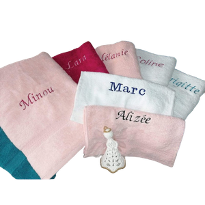 Françoise Saget met à votre disposition un service de broderie proposant de personnaliser votre linge de toilette A partir de 6,90€ votre produit brodé deviendra unique Agrémentez votre serviette, peignoir ou Nightbag par le nom, le prénom ou le surnom de la personne à qui vous avez envie de faire plaisir!. Serviette de toilette personnalisée au prénom ou petit texte de votre choix Cette serviette convient très bien en cadeau pour un bébé, un enfant ou un adulte Chaque couleurs existent en 3 tailles (selon les disponibilités) 50x100cm, 70x140cm, 100x150cm. Faites entrer le personnalisé dans votre salle de bain avec notre gamme de serviettes de bain brodées.