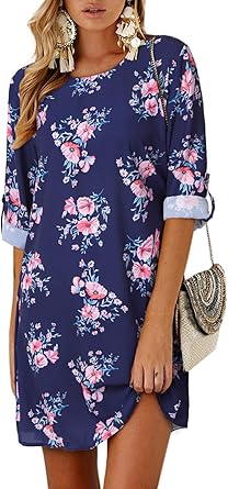 Robe Fleurie Femme Ete Moulante Boheme Hippie Chic Tunique Manche 3 4 Col Rond Casuel Chemise