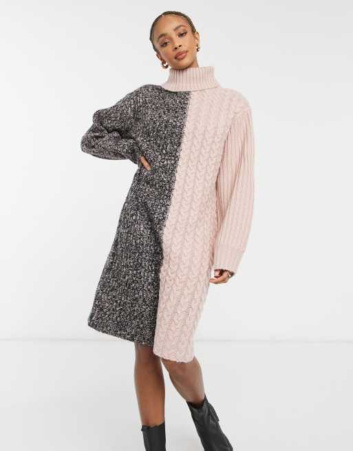 Violet Romance Robe Pull Col Roule En Tricot Torsade Contrastant Rose Evesham Nj