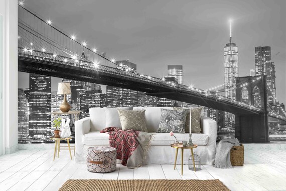 Ny Brooklyn Bridge Black White Wallpaper Room Sticker Night Etsy