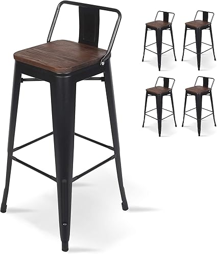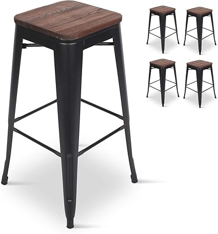 Kosmi Lot De 4 Tabourets De Bar En Metal Noir Mat Et Assise En Bois Fonce Tabouret Metal Et Bois Haut Hauteur 66cm Ideal Pour Une Table De 90cm Amazon Fr Cuisine