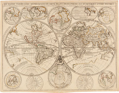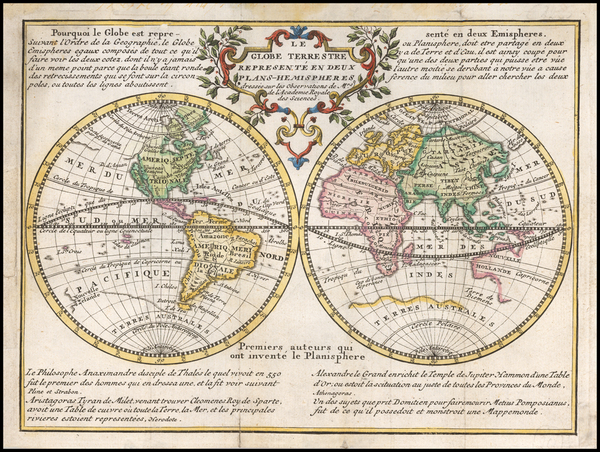 Mappe Monde Geo Hydrographique Ou Description Generale Du Globe Terrestre Et Aquatique En Deux Plans Hemipsheres Ou Son Exactement Remarquees En General Toutes Les Parties De La Terre Et De L Eau Suivant Les Relations Les Plus