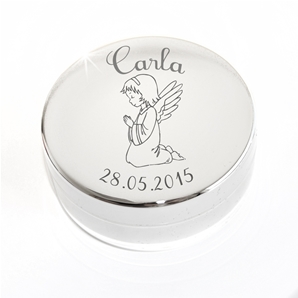 Boite A Bijoux Theme Bapteme Motif Ange Prenom Plaque Argent Suedine Bleue