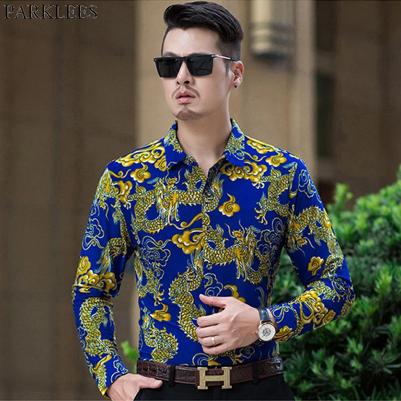 Gold Dragon Pattern Printed Blue Shirt Men 18 Brand New Slim Fit Long Sleeve Chemise Homme Chinese Style Social Shirt Male 4xl Casual Shirts Aliexpress