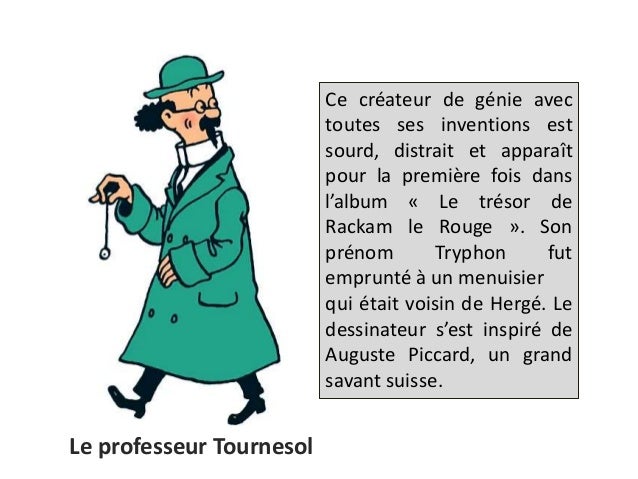 Tintin Introduction Nous allons faire une activité sur Tintin car le 10 janvier, on a fêté son 80 ème anniversaire Tout d'abord, je vais vous faire une brève présentation du créateur, auteur des Aventures de Tintin et Milou, puis vous me direz quelles bandes dessinées vous connaissez;. Chers Visiteurs, Puisque nous avons réussi à résoudre cette ligne de puzzle qui a pour indice CodyCross Prénom du professeur Tournesol, nous allons partager les réponses à ce puzzle dans ce sujetEn ce moment, le jeu est bien positionné dans les stores puisqu’il propose un type unique de mots croisés avec un graphique exceptionnel. Pour créer Tournesol, Hergé s'est inspiré du réel Tournesol et son sousmarin, c'est Auguste Piccard et son bathyscaphe, mais en taille réduite Le prénom étrange du professeur a aussi été repris par Hergé à un personne réelle, il s'agissait d'un menuisier de sa connaissance.