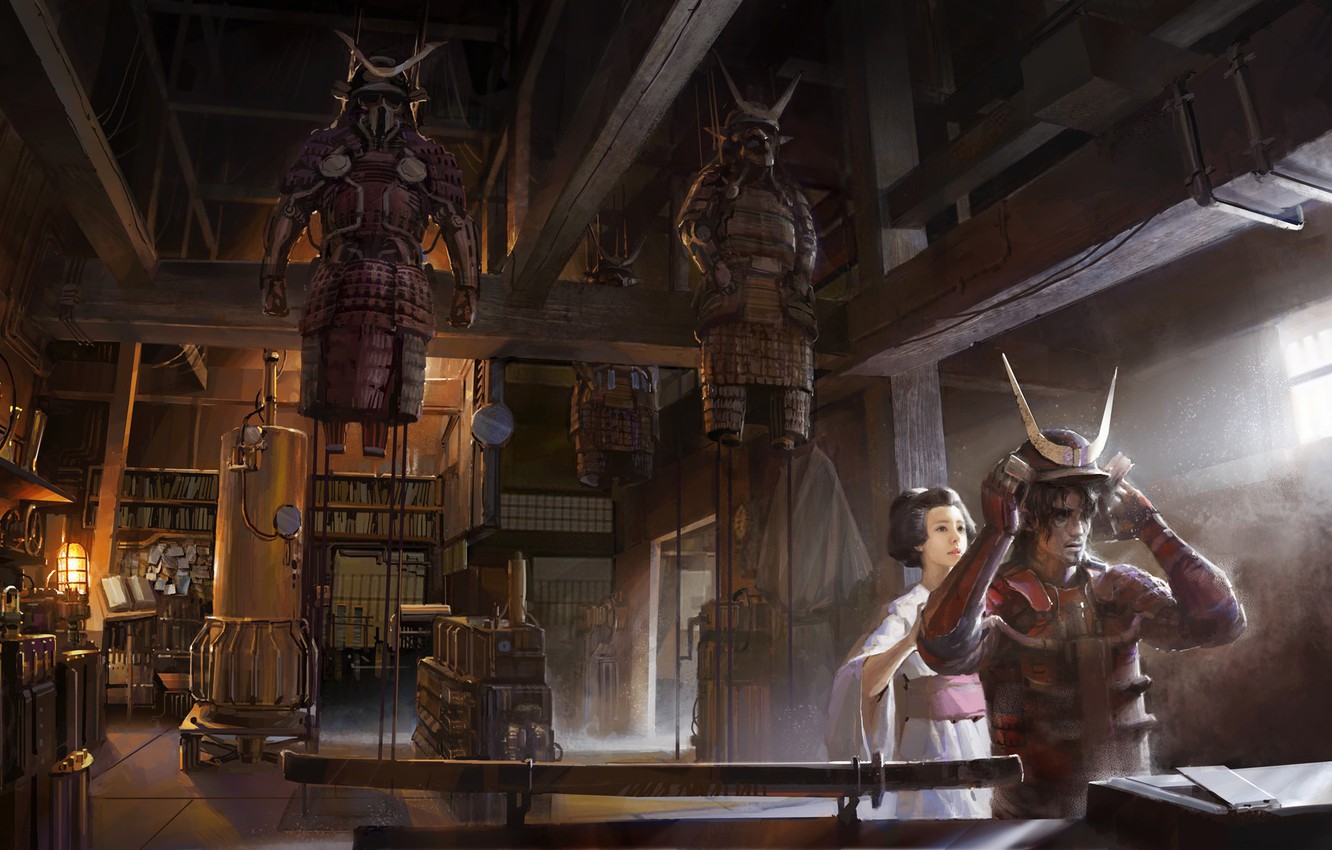 Photo Wallpaper Warrior Horns Helmet The Room Steampunk Samurai Steampunk Fan Art 1332x850 Wallpaper Teahub Io